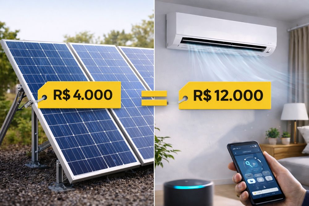 Quanto Custa uma Placa Solar para Ligar um Ar-Condicionado? Análise de Viabilidade 2026 Uma das perguntas mais pesquisadas por quem quer cortar a conta de luz no verão. A resposta envolve física, irradiação solar, tarifas elétricas e matemática financeira — e muda bastante dependendo de onde você mora. ☀️ Painéis necessários 2 a 6 para um ar-condicionado de 12.000 BTU inverter, dependendo de horas de uso e cidade 💰 Custo sistema completo R$ 10–28 mil sistema on-grid instalado para residências com ar-condicionado (4–6 kWp) 📅 Payback médio 4 a 8 anos dependendo da cidade, tarifa e consumo. O sistema dura 25+ anos 01 — O Ponto de Partida Primeiro: quanto o seu ar-condicionado realmente consome Antes de dimensionar um sistema solar, é preciso saber quanto de energia o ar-condicionado consome por mês. O número que aparece na etiqueta Procel é o consumo mensal em kWh/mês — calculado com base em 8 horas de uso por dia, durante todo o mês, em condições de laboratório. Use-o como referência, mas ajuste para o seu padrão de uso real. Consumo mensal estimado por potência — ar-condicionado inverter (8h/dia, 30 dias) Potência Consumo (kWh/mês) Custo mensal* Painel 550W gera† Painéis necessários 9.000 BTU ~57 kWh ~R$ 50–80 55–73 kWh/mês 1 a 2 painéis 12.000 BTU ~60–80 kWh ~R$ 55–100 55–73 kWh/mês 1 a 2 painéis 18.000 BTU ~120–140 kWh ~R$ 110–180 55–73 kWh/mês 2 a 3 painéis 24.000 BTU ~150–180 kWh ~R$ 140–220 55–73 kWh/mês 3 a 4 painéis * Tarifa média de R$ 0,85–0,95/kWh (bandeira verde, 2026). † Geração por painel de 550W no Sudeste (HSP ≈ 4,9 h/dia, eficiência 75%). Valores variam por cidade — veja a seção de irradiação. ⚠️ Atenção ao número da etiqueta Procel. O consumo declarado em kWh/mês considera o aparelho operando em carga parcial (não a 100% do tempo). Na prática, com 8 horas reais de uso por dia em dias quentes, o consumo pode ser 15–30% maior. Para dimensionar o sistema solar com segurança, adicione 20% sobre o consumo da etiqueta. 02 — O Cálculo Como calcular o número de painéis com precisão A quantidade de painéis solares necessária depende de três variáveis: o consumo mensal do aparelho (em kWh), a irradiação solar da sua cidade (em horas de sol pleno por dia — HSP) e a eficiência real do sistema. A fórmula usada pelos dimensionadores fotovoltaicos segue o padrão do CRESESB (Centro de Referência para as Energias Solar e Eólica Sérgio de Salvo Brito): Fórmula de Dimensionamento — CRESESB Geração mensal por painel = Potência (Wp) × HSP × Eficiência × 30 dias ÷ 1.000 Nº de painéis = Consumo mensal (kWh) ÷ Geração por painel Onde: Potência (Wp) = Potência nominal do painel (ex: 550 Wp) HSP = Horas de Sol Pleno da sua cidade (ver tabela abaixo) Eficiência = 0,75 (75% — estimativa conservadora considerando perdas térmicas, sujeira, inversores e cabeamento) 30 = Dias do mês 📐 Exemplo prático — São Paulo, 12.000 BTU inverter, 8h/dia: Consumo mensal do aparelho = 60 kWh. Painel de 550 Wp. HSP São Paulo = 4,90 h/dia. Geração por painel = 550 × 4,90 × 0,75 × 30 ÷ 1.000 = 60,7 kWh/mês Painéis necessários = 60 ÷ 60,7 ≈ 1 painel — mas para o sistema on-grid completo residencial, o dimensionamento considera toda a casa, não só o ar-condicionado. 03 — Irradiação Solar Horas de sol pleno por cidade: o fator que mais muda o número de painéis A irradiação solar (HSP — Horas de Sol Pleno) é o fator mais importante e mais ignorado. A diferença entre Fortaleza e Curitiba pode representar quase o dobro de painéis necessários para o mesmo consumo. Os dados abaixo são baseados no Atlas Solarimétrico do INPE/LABREN: Fortaleza 5,90 HSP (h/dia) Natal 5,80 HSP (h/dia) Recife 5,65 HSP (h/dia) Brasília 5,50 HSP (h/dia) Belo Horizonte 5,20 HSP (h/dia) São Paulo 4,90 HSP (h/dia) Rio de Janeiro 4,80 HSP (h/dia) Porto Alegre 4,60 HSP (h/dia) Curitiba 4,50 HSP (h/dia) 04 — O Custo Quanto custa o sistema completo instalado A pergunta correta não é “quanto custa uma placa solar” — porque a placa sozinha não resolve nada. O custo relevante é o do sistema fotovoltaico instalado, que inclui os módulos, o inversor, a estrutura de fixação, cabeamento, string box e a mão de obra de instalação e homologação junto à distribuidora. Um módulo de 550W custa entre R$ 700 e R$ 1.100 no varejo (Greener, 2025). Mas esse valor representa apenas 25–40% do custo total do sistema instalado. 🔆 Painéis fotovoltaicos R$ 700–1.100/un 550–600 Wp · PERC monocristalino 25–40% do total ⚡ Inversor solar (string) R$ 2.000–6.000 Growatt, Deye, Sungrow, WEG ~20% do total 🔧 Estrutura + cabeamento R$ 1.500–3.000 perfis alumínio, cabos 6mm², string box ~15% do total 👷 Instalação + homologação R$ 2.000–5.000 ANEEL · REN 1.059/2023 · ART 25–35% do total Custo do sistema completo instalado por porte — Residencial On-Grid 2026 (Greener / Portal Energia Brasil) Perfil da Casa Potência do sistema Painéis (550W) Investimento médio Economia/mês estimada Pequena (1 ar-cond. 12k BTU) 1,5 a 2,5 kWp 3 a 5 R$ 10.000–15.000 R$ 120–200/mês Média (2 ar-cond. + eletrod.) 4 a 6 kWp 7 a 11 R$ 18.000–28.000 R$ 280–450/mês Grande (3+ ar-cond. + piscina) 8 a 12 kWp 15 a 22 R$ 35.000–55.000 R$ 500–900/mês Comercial (escritório/comércio) 15 a 30+ kWp 27 a 55+ A partir de R$ 60.000 Proporcional ao porte 💡 Por que não dimensionar apenas para o ar-condicionado? Do ponto de vista financeiro, quase nunca faz sentido instalar um sistema solar exclusivo para um único aparelho. O ideal é dimensionar para cobrir toda a conta de luz da casa — o sistema fica mais eficiente por kWp instalado, a homologação é feita uma vez só e o payback fica muito melhor. O ar-condicionado entra como parte do consumo total a ser compensado. 05 — Qual Sistema Escolher On-grid ou off-grid: qual faz sentido para o ar-condicio