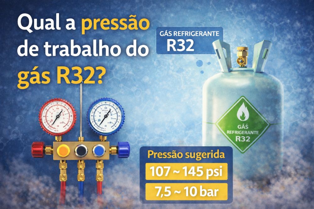 Tudo que o técnico refrigerista precisa saber: faixas de baixa e alta pressão, tabela Pressão × Temperatura, comparativo com R410A, erros comuns e protocolos de segurança. O que é o R32 e por que dominou o mercado O R32, cujo nome químico é difluorometano (CH₂F₂), é um fluido refrigerante puro classificado como HFC (hidrofluorcarboneto). Diferente do R410A — mistura binária de R32 + R125 — o R32 é um componente único, o que facilita o recolhimento e a regeneração sem risco de fracionamento. A Daikin foi pioneira mundial no uso do R32 em condicionadores de ar. No Brasil, desde 2024, uma resolução regulatória passou a exigir que todos os novos aparelhos split residenciais produzidos no país já saiam de fábrica com R32, em linha com o Protocolo de Montreal e os acordos de Kigali para redução de HFCs de alto GWP. // Contexto regulatório O Protocolo de Montreal (1987) e a Emenda de Kigali (2016) estabelecem um calendário global de redução de HFCs de alto Potencial de Aquecimento Global (GWP). O R410A, com GWP ≈ 2.088, está sendo substituído pelo R32, com GWP ≈ 675 — cerca de 1/3 do impacto climático. Propriedades físico-químicas básicas O R32 é incolor e praticamente inodoro. Apresenta ponto de ebulição de −51,6 °C a pressão atmosférica normal. Temperatura crítica: 78,1 °C. Pressão crítica: 57,8 bar. É miscível com óleos POE (polioléster), os mesmos utilizados com R410A, simplificando a manutenção de sistemas compatíveis. A pressão de trabalho do R32: números reais Esta é a pergunta central. A resposta envolve dois lados do circuito — e é fundamental não confundir: Faixas de pressão de operação normal — R32 em split Ponto do circuito PSI (manométrico) Bar (manométrico) Baixa pressão (sucção / evaporação) 107–145 PSI 7,4–10 bar Alta pressão (descarga / condensação) 280–400 PSI 19,3–27,6 bar Teste estanqueidade com N₂ (leak test) 500–550 PSI 34,5–37,9 bar Vácuo mínimo antes da carga ≤ 500 microns (29,9 inHg) // Atenção — variação por condições de campo As faixas acima são referências para temperatura ambiente entre 25 °C e 35 °C. Em dias de calor extremo (acima de 40 °C), a pressão de alta pode ultrapassar 400 PSI. O correto é sempre cruzar pressão com temperatura de saturação — nunca avaliar a pressão de forma isolada. Tabela Pressão × Temperatura de saturação A relação entre pressão e temperatura de saturação é a ferramenta mais importante para um diagnóstico correto. Com ela você descobre se o sistema está com carga adequada, superaquecimento correto e sub-resfriamento dentro da especificação. ★ = faixas de operação típica em ar-condicionado split residencial/comercial. Temp. Sat. (°C) P. Absoluta (bar) P. Manométrica (bar) Pressão (PSI man.) Fase típica no ciclo −20 °C 3,00 2,00 29 PSI Evaporação (câmara fria) −10 °C 4,35 3,35 48 PSI Evaporação (baixa carga) 0 °C 5,99 4,99 72 PSI Evaporação (condição limite) 5 °C 7,07 6,07 88 PSI Evap. típica split A/C ★ 10 °C 8,32 7,32 106 PSI Evap. normal split A/C ★ 20 °C 11,33 10,33 150 PSI Sucção elevada 30 °C 15,15 14,15 205 PSI Condensação (noite/frio) 40 °C 19,90 18,90 274 PSI Condensação típica verão ★ 45 °C 22,71 21,71 315 PSI Condensação normal verão quente ★ 50 °C 25,80 24,80 360 PSI Condensação (dia muito quente) 55 °C 29,15 28,15 408 PSI Condensação (alta carga) Fonte: Propriedades termodinâmicas do R32 conforme NIST WebBook e tabelas técnicas dos fabricantes (Daikin, Gas-Servei/Arkema). Pressão manométrica = pressão absoluta − 1,013 bar. // Como usar esta tabela em campo Exemplo prático: Seu split está operando e a temperatura de evaporação esperada é 10 °C. A tabela indica que a baixa pressão deve estar em torno de 106 PSI. Se o manômetro marcar 70 PSI, há suspeita de falta de gás ou entupimento no filtro secador. Superaquecimento e sub-resfriamento Para o R32, os valores ideais em condições de campo normais são: Comparativo técnico: R32 vs R410A Entender as diferenças precisas entre os dois fluidos evita erros de diagnóstico — afinal, muitos sistemas ainda operam com R410A e técnicos migram entre os dois sem ajustar os parâmetros de referência. Propriedade R32 R410A Fórmula química CH₂F₂ (fluido puro) R32 (50%) + R125 (50%) GWP (AR5) 675 2.088 ODP 0 0 Classe ASHRAE A2L (leve inflamável) A1 (não inflamável) Pressão baixa típica 107–145 PSI 118–145 PSI Pressão alta típica 280–400 PSI 300–420 PSI Carga no sistema Menor (~30% menos) Maior Ponto de ebulição −51,6 °C ~−51,5 °C (mistura) Lubrificante POE POE Carga por fase Líquido ou gás Somente líquido // CRÍTICO — Não são intercambiáveis R32 e R410A não podem ser misturados nem substituídos diretamente. O R410A é uma mistura azeotrópica: o fracionamento em caso de carregamento parcial altera sua composição. Usar R32 em sistemas não homologados pode causar danos ao compressor, sobrepressão e anulação de garantia. Como medir corretamente a pressão do R32 Equipamentos necessários Protocolo de medição em campo // Carga por massa — não por pressão Para o R32, a carga deve ser realizada sempre por massa (gramas) com balança frigorífica, nunca pela pressão do manômetro. A pressão varia com a temperatura ambiente e não é parâmetro confiável isolado para definir a quantidade de fluido no sistema. Orientação reforçada pelos manuais da Daikin e pela ABNT NBR 16069. Erros comuns — e como evitá-los Erro 01 — Usar manômetro de R22 ou R410A para diagnosticar R32 As escalas secundárias de pressão-temperatura no manifold são fluido-específicas. Ler a escala errada leva a diagnósticos invertidos. Use sempre manômetro homologado para R32 ou leia apenas a escala PSI/bar e consulte a tabela P×T correta. Erro 02 — Complementar a carga sem checar o vazamento Em caso de perda de pressão, o correto é localizar e re