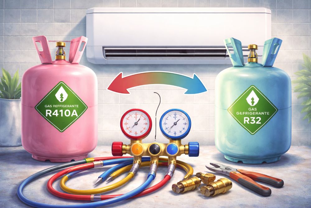 A resposta curta é não — mas há nuances importantes. Este guia explica o porquê em detalhe técnico, com base nas orientações de fabricantes e normas internacionais, e define exatamente o que é e o que não é permitido na prática de campo. A resposta direta — e o que ela realmente significa Não. Não é possível simplesmente substituir o gás R410A por R32 em um aparelho de ar-condicionado originalmente projetado para R410A — nem o inverso. Esta é a posição oficial da Daikin, pioneira mundial no uso do R32, da Danfoss e do consenso técnico do setor. A confusão é compreensível: o R410A é, na sua composição, uma mistura de 50% de R32 com 50% de R125. Muitos técnicos presumem que, se o R32 já está dentro do R410A, poderia ser usado em seu lugar. Essa lógica ignora diferenças físico-químicas críticas que impactam o compressor, as válvulas e os sensores do sistema. // Distinção fundamental que todo técnico precisa internalizar Substituir apenas o fluido refrigerante (“retrofit de gás”) em um aparelho R410A usando R32 não é permitido. Porém, trocar o aparelho inteiro (R410A descartado, novo split R32 instalado) e reaproveitar a tubulação de cobre (se era R410A e estiver em bom estado) É permitido, desde que feita a limpeza interna adequada. Por que R32 e R410A não são intercambiáveis São fluidos termodinamicamente distintos Embora o R32 seja um componente do R410A, quando puro ele tem comportamento termodinâmico diferente: maior eficiência de troca térmica, maior temperatura de descarga e capacidade volumétrica superior. Um sistema projetado para R410A foi dimensionado com essas variáveis calculadas para o blend — não para o R32 puro. Segundo a Danfoss, fabricante global de componentes para refrigeração: o R32 tem cerca de 10% mais capacidade que o R410A como substituto direto, o que pode resultar em sobrecarga de componentes não projetados para essa diferença. A válvula de expansão eletrônica (VEE) não é compatível Um dos pontos mais críticos é a válvula de expansão eletrônica. Nos aparelhos modernos com R410A, a VEE é calibrada para as curvas de pressão-entalpia do R410A. Ao usar R32, as condições de operação mudam: pressão de saturação, temperatura de descarga e fluxo de massa por unidade de deslocamento são diferentes. O resultado é uma expansão incorreta, que pode gerar: O compressor não é homologado Os compressores de aparelhos R410A são projetados e homologados pelo fabricante para operar com aquele fluido específico. A Daikin declara explicitamente: “Por enquanto substituir apenas o refrigerante de um condicionador, seja R22 ou R410A, pelo R32 não é possível.” Usar R32 em compressor não homologado anula a garantia e representa risco real de falha mecânica. O R410A é um blend e não pode ser misturado O R410A é uma mistura azeotrópica. Em caso de vazamento parcial, os componentes da mistura (R32 e R125) evaporam em taxas diferentes, alterando a proporção remanescente no sistema. Isso já cria um problema em sistemas R410A. Se ainda houver resíduo de R410A ao fazer uma carga de R32 puro, a composição resultante no sistema será indeterminada, com comportamento imprevisível de pressão e temperatura. “O contato entre resíduos do R32 e o R410A pode afetar a lubrificação do compressor, principalmente em regimes de alta carga térmica. Isso pode gerar carbonização do óleo, entupimento de capilares e até falha total do compressor.” Tabela de cenários: o que é e o que não é permitido Abaixo, um mapa claro de cada situação que um técnico pode encontrar em campo: Cenário Aparelho original Fluido novo Veredicto técnico Troca do aparelho inteiro Split R410A (descartado) Novo aparelho R32 ✅ PERMITIDO — reuse da tubulação após limpeza (se era R410A) Retrofit só do fluido Split R410A (mantido) R32 no mesmo aparelho ⛔ NÃO PERMITIDO — compressor, VEE e sensores não são homologados Complemento de carga Split R32 R32 ✅ PERMITIDO — desde que o fluido seja o mesmo e sem mistura Mistura emergencial Split R32 R410A + R32 misturados ⛔ PROIBIDO — mistura altera proporções e danifica compressor Tubulação de R410A com aparelho R32 novo Infra de cobre R410A Aparelho R32 novo ✅ PERMITIDO — mesma bitola; exige limpeza interna prévia obrigatória Legenda: ✅ Permitido com os cuidados indicados · ⛔ Não permitido · ⚠️ Não recomendado sem avaliação técnica prévia Comparativo técnico: R32 vs R410A Conhecer as diferenças fundamentais entre os dois fluidos é o que permite ao técnico tomar a decisão certa em campo: Propriedade R32 R410A Composição Fluido puro (CH₂F₂) Mistura R32 (50%) + R125 (50%) GWP (AR5) 675 2.088 Classe ASHRAE 34 A2L (leve inflamável) A1 (não inflamável) Carga típica no sistema ~30% menor que R410A Referência Lubrificante POE POE Compatibilidade entre si NÃO — fluidos distintos NÃO — fluidos distintos Carga por fase Líquido ou gás Somente líquido (blend) Temperatura de descarga Mais alta (cuidado em VEE) Menor Reciclagem Simples (fluido puro) Complexa (blend pode fracionar) E a tubulação de cobre — posso reutilizar? Esta é uma das perguntas mais frequentes quando um cliente troca o aparelho antigo (R410A) por um novo (R32). A resposta depende da origem da tubulação: // Tubulação de R410A → aparelho R32 novo ✅ SIM, é permitido. A Daikin confirma: “é possível manter a mesma infraestrutura frigorífica” quando a tubulação era de R410A. Os diâmetros de cobre compatíveis com R410A atendem ao R32. Porém, é obrigatório realizar limpeza interna da linha com produto adequado (ex.: flush com R141b ou nitrogênio seco) // Tubulação de R22 → aparelho R32 novo ⚠️ NÃO RECOMENDADO sem avaliação. A Daikin é clara: “Se o equipamento anterior utilizava R22, faça uma nova tubulação frigorífica!” O R22 usa óleos lubrificantes minerais (incompatíveis com POE do R32) e pode te