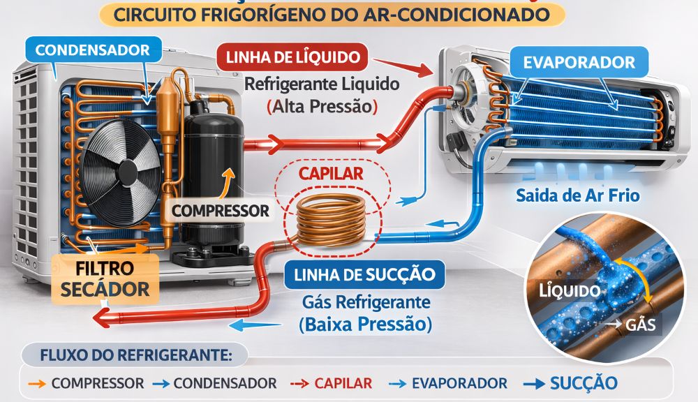 Se o seu ar-condicionado parou de gelar, está com o evaporador coberto de gelo, ou o compressor desligando sozinho com frequência, existe uma boa chance de que o problema esteja em um componente pequeno, barato e muitas vezes ignorado: o tubo capilar. Apesar do tamanho modesto, o capilar é responsável por uma função crítica no ciclo de refrigeração. Quando ele entope, as consequências se espalham por todo o sistema — e podem culminar na perda total do compressor, o componente mais caro do ar-condicionado. Neste artigo você vai entender exatamente o que é o tubo capilar, por que ele entope, e o que acontece com o equipamento quando isso ocorre. O Que é o Tubo Capilar e Qual é a Sua Função O tubo capilar é um dispositivo de expansão. Trata-se de um tubo de cobre com diâmetro interno muito reduzido — geralmente entre 0,6 mm e 2 mm — com comprimento variando de 1 a 3 metros, dependendo da capacidade do equipamento. Sua função é simples na teoria e crítica na prática: criar uma restrição controlada ao fluxo do fluido refrigerante, provocando uma queda brusca de pressão e temperatura. É essa expansão que permite ao refrigerante absorver calor dentro do ambiente no evaporador. Em termos técnicos: o capilar separa o lado de alta pressão (condensador) do lado de baixa pressão (evaporador). Sem ele funcionando corretamente, o ciclo de refrigeração entra em colapso. Diferente de válvulas de expansão termoestática (TXV), usadas em sistemas maiores, o capilar é um componente fixo — não tem partes móveis, não regula ativamente. Por isso, qualquer obstrução, mesmo parcial, compromete imediatamente o desempenho do sistema. Por Que o Capilar Entope? O entupimento do capilar tem causas bem definidas. As mais comuns são: 1. Umidade no Sistema (Formação de Gelo) A umidade é a principal inimiga do sistema de refrigeração. Quando há presença de água no circuito — seja por falha na evacuação no momento da instalação, por manutenção incorreta ou por vazamento de ar externo — ela migra com o fluido refrigerante até encontrar o ponto de maior queda de pressão e temperatura: a entrada do capilar. Nesse ponto, a água congela e forma um tampão de gelo que bloqueia o fluxo parcial ou totalmente. O sintoma clássico é um comportamento intermitente: o aparelho funciona por um tempo, para de gelar, e depois volta a funcionar após desligar por um período — que é exatamente o tempo que o gelo leva para derreter. 2. Resíduos de Óleo Oxidado ou Carbonizado O óleo lubrificante do compressor circula junto com o fluido refrigerante em pequenas quantidades. Com o tempo, especialmente após superaquecimento do compressor ou uso de óleo incompatível com o fluido refrigerante utilizado, esse óleo se oxida, polimeriza e forma depósitos que se acumulam progressivamente no interior do capilar até obstruí-lo. 3. Partículas Metálicas (Contaminação Sólida) Desgaste interno do compressor, oxidação de conexões de cobre ou resíduos de soldagem sem uso de nitrogênio geram partículas sólidas que circulam com o refrigerante e se acumulam no filtro secador ou diretamente no capilar. 4. Sujeira e Resíduos Externos Em sistemas com histórico de vazamento e recarga incorreta, ou onde o refrigerante foi substituído sem a devida limpeza do circuito, é comum encontrar contaminantes diversos — incluindo resíduos do próprio kit de recarga — que formam depósitos no capilar. O Que Acontece Com o Ar-Condicionado Quando o Capilar Entope Os efeitos do entupimento do capilar se manifestam em cadeia, afetando progressivamente todos os componentes do sistema. Entender essa sequência é fundamental para diagnosticar corretamente o problema. Efeito 1: Desequilíbrio de Pressões A primeira consequência é imediata e direta. Com o fluxo de refrigerante bloqueado ou reduzido, o sistema perde sua capacidade de manter o diferencial de pressão adequado entre os dois lados do circuito: Em um sistema normal de split residencial com R-410A, a pressão de sucção fica entre 110 e 130 psi. Com capilar entupido, ela pode cair para menos de 30 psi ou até atingir vácuo negativo. Efeito 2: Falha no Resfriamento — O Ar-Condicionado Não Gela Sem refrigerante chegando ao evaporador em quantidade suficiente, a serpentina interna perde a capacidade de absorver calor do ambiente. O resultado mais imediato é simples e óbvio: o aparelho liga, o ventilador funciona, mas o ar sai quente ou levemente fresco — sem refrigeração real. Efeito 3: Congelamento do Evaporador Paradoxalmente, o capilar entupido pode causar o congelamento da serpentina interna. Como a pressão de sucção cai muito, o ponto de ebulição do refrigerante que está no evaporador também cai drasticamente. O pouco refrigerante que passa começa a evaporar a temperaturas muito abaixo de zero, congelando a umidade do ar ao redor da serpentina. O evaporador fica coberto por uma camada de gelo que vai crescendo até bloquear completamente o fluxo de ar — agravando ainda mais a falta de refrigeração e podendo causar gotejamento intenso quando o gelo derrete. Efeito 4: Superaquecimento do Compressor Aqui começa a parte mais grave e cara do problema. O compressor dos splits residenciais é resfriado internamente pelo próprio gás refrigerante que aspira. Quando a sucção cai — seja por entupimento total ou parcial — o fluxo de gás que resfria o motor interno do compressor é insuficiente. O motor do compressor começa a operar em temperatura progressivamente mais alta. O protetor térmico desliga o equipamento quando a temperatura ultrapassa o limite seguro — daí os desligamentos frequentes. Mas cada ciclo de superaquecimento degrada o isolamento do enrolamento elétrico do motor. Efeito 5: Falta de Lubrificação O óleo lubrificante do compressor circula misturado ao fluido refrigerante. Sem fluxo adequado de refrigerante, o óleo também não retorna ao compressor. Os componentes 
