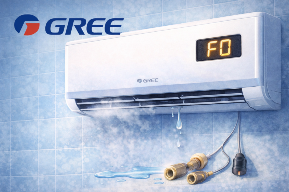 O F0 é um dos códigos mais pesquisados nos aparelhos Gree — e também um dos mais mal interpretados, porque o seu significado muda dependendo da linha e do modelo. Em splits Hi-Wall e ducted, aponta para o sensor de temperatura ambiente. Na linha Vireo e portáteis, indica proteção por vazamento de refrigerante. Este guia técnico cobre os dois cenários com fontes verificadas e passo a passo de diagnóstico.