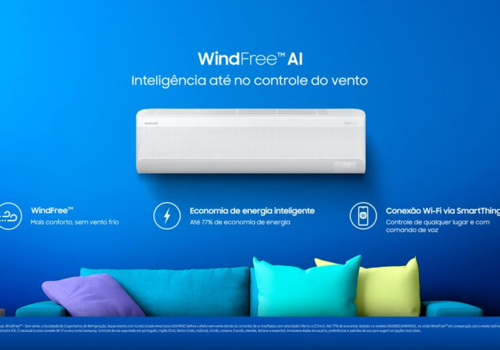 O Samsung WindFree AI combina inteligência artificial adaptativa, a exclusiva tecnologia WindFree de 23.000 microfuros, conectividade total via SmartThings e um compressor Digital Inverter Ultra que entrega até 77% de economia de energia. É o modelo Samsung com mais recursos tecnológicos na categoria residencial, projetado para aprender com o usuário e ajustar o ambiente de forma autônoma.