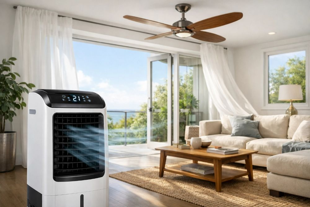 Funciona puxando o ar quente do ambiente, fazendo-o passar por um painel úmido (pad de celulose ou fibra sintética) e devolvendo um fluxo de ar mais fresco e umidificado. Não usa compressor nem gás refrigerante — a física por trás é simples: a evaporação da água absorve calor. Pode reduzir a sensação térmica em até 8°C em ambientes secos.