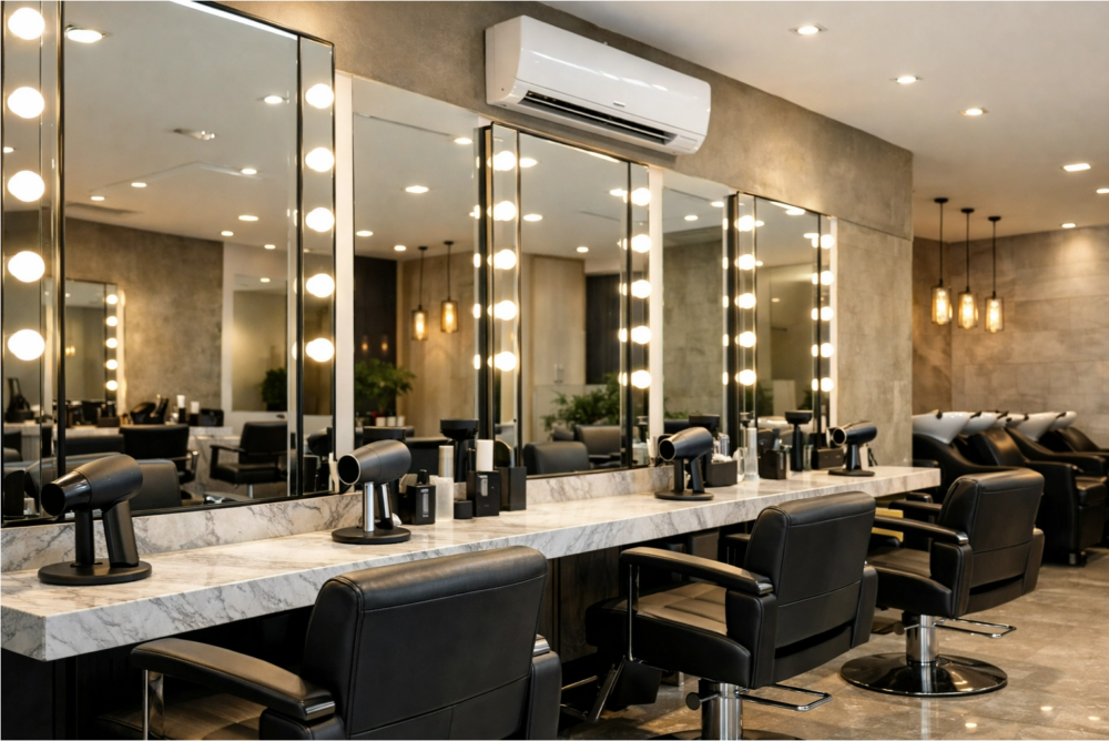 A maioria dos salões usa splits residenciais — o mesmo tipo vendido para quartos e salas. Eles foram projetados para ambientes com umidade relativa entre 50% e 65%, temperatura externa de até 43°C e cargas latentes baixas.